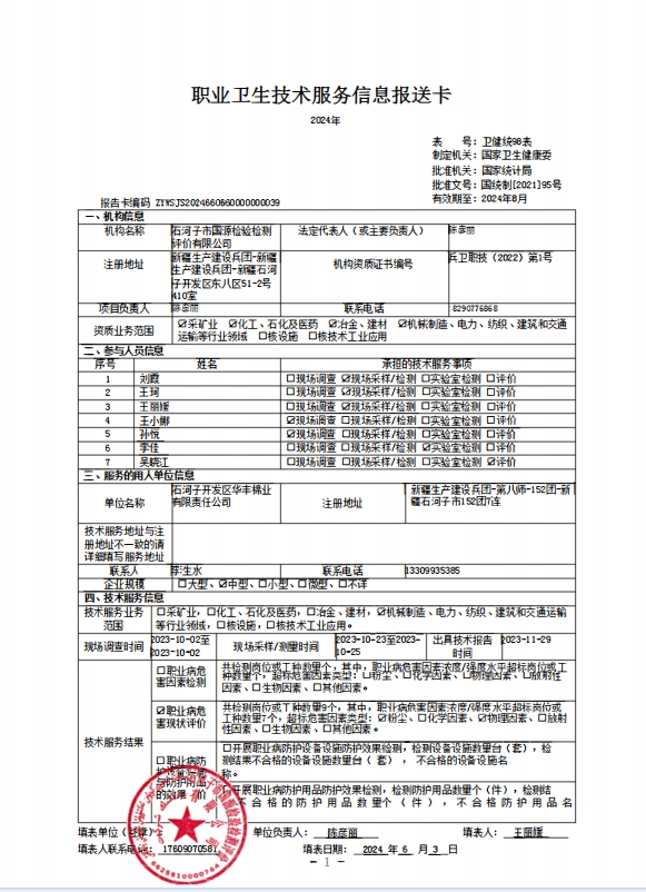 石河子开发区华丰棉业有限责任公司职业病危害现状评价
